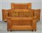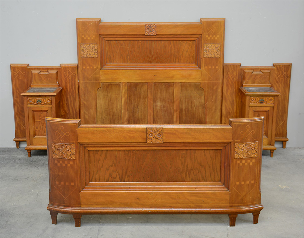 Letto matrimoniale "Liberty" con comodini incorporati nella testata, in legno intagliato a fiori e foglie e filettato a motivi geometrici. Comodini ad un anta ed un cassetto e pianetto in marmo. 1910 ca. (larghezza totale cm 362)(Difetti)
