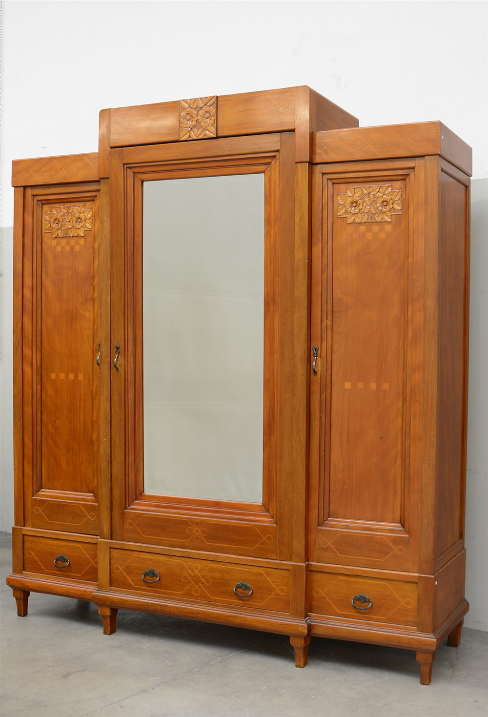Armadio "Liberty" a tre ante di cui quella centrale a specchio e tre cassetti alla base, in legno intagliato a fiori e foglie e filettato a motivi geometrici. 1910 ca. (Cm 202x234x62)(difetti)