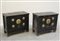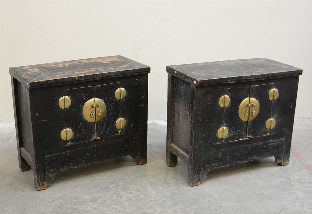 Coppia di mobiletti cinesi a due ante in legno laccato in nero con dettagli in metallo (difetti) Cina, sec. XX (cm. 80x70x40)