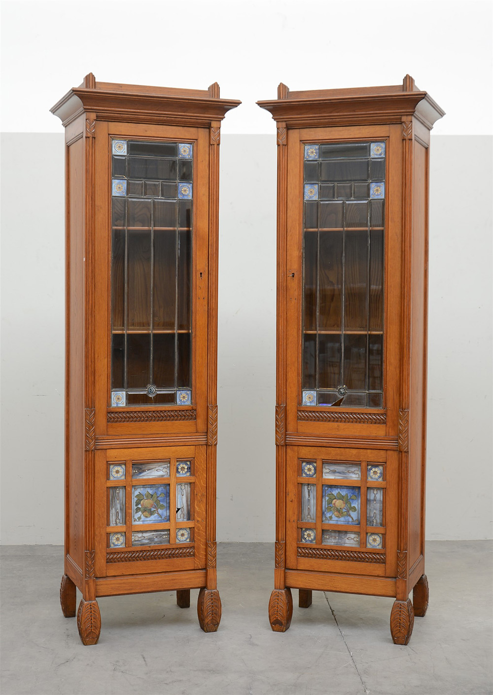 Coppia di vetrinette a due ante con vetri legati al piombo, montanti scanalato ed intagliati a motivi vegetali, anni '20 ca. (cm 63x205x46)(difetti)