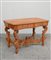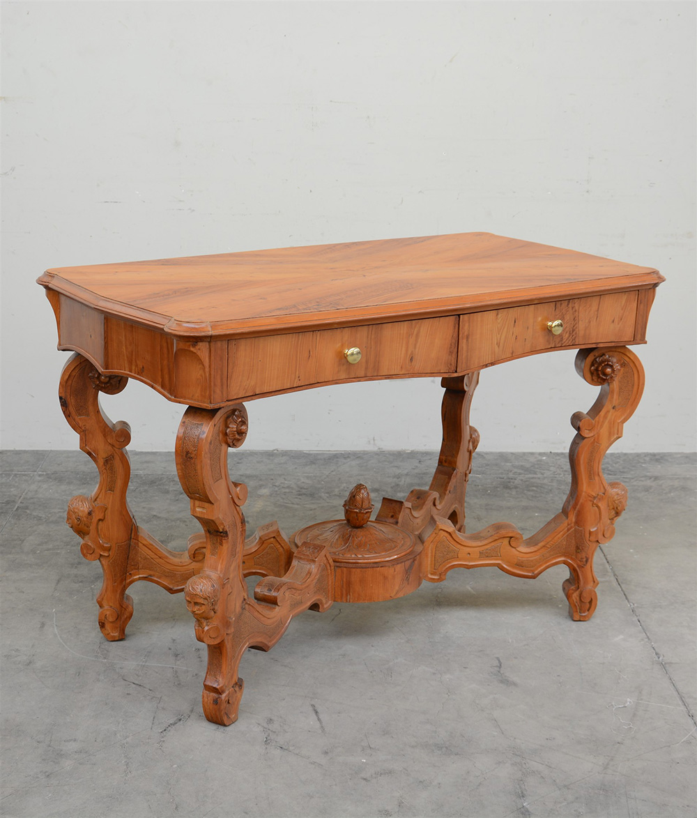 Tavolo scrittoio da centro lastronato in radica a due cassetti, gambe e traverse sagomate ed intagliate (cm 120x80x68)(difetti)