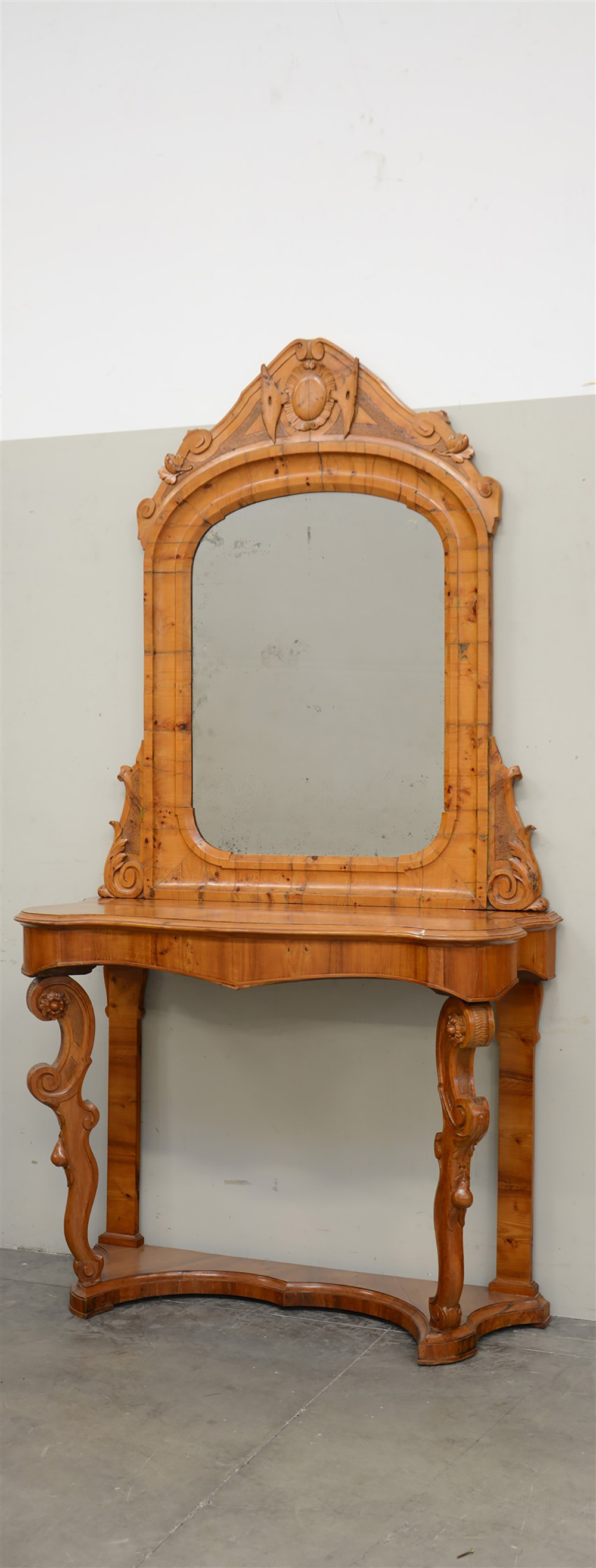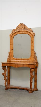 Console con specchiera lastronato in radica, gambe anteriori sagomate ed intagliate (cm 120x228x49)(difetti)