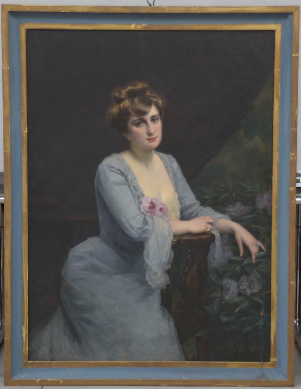 Fanny Laurent Fleuny "Ritratto di gentildonna" olio su tela (cm 130x100) firmato in basso a destra, in cornice (difetti)