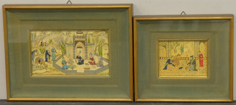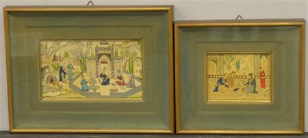 Arte persiana. Lotto composto da due pannelli raffiguranti scene di vita. Misure diverse in cornici