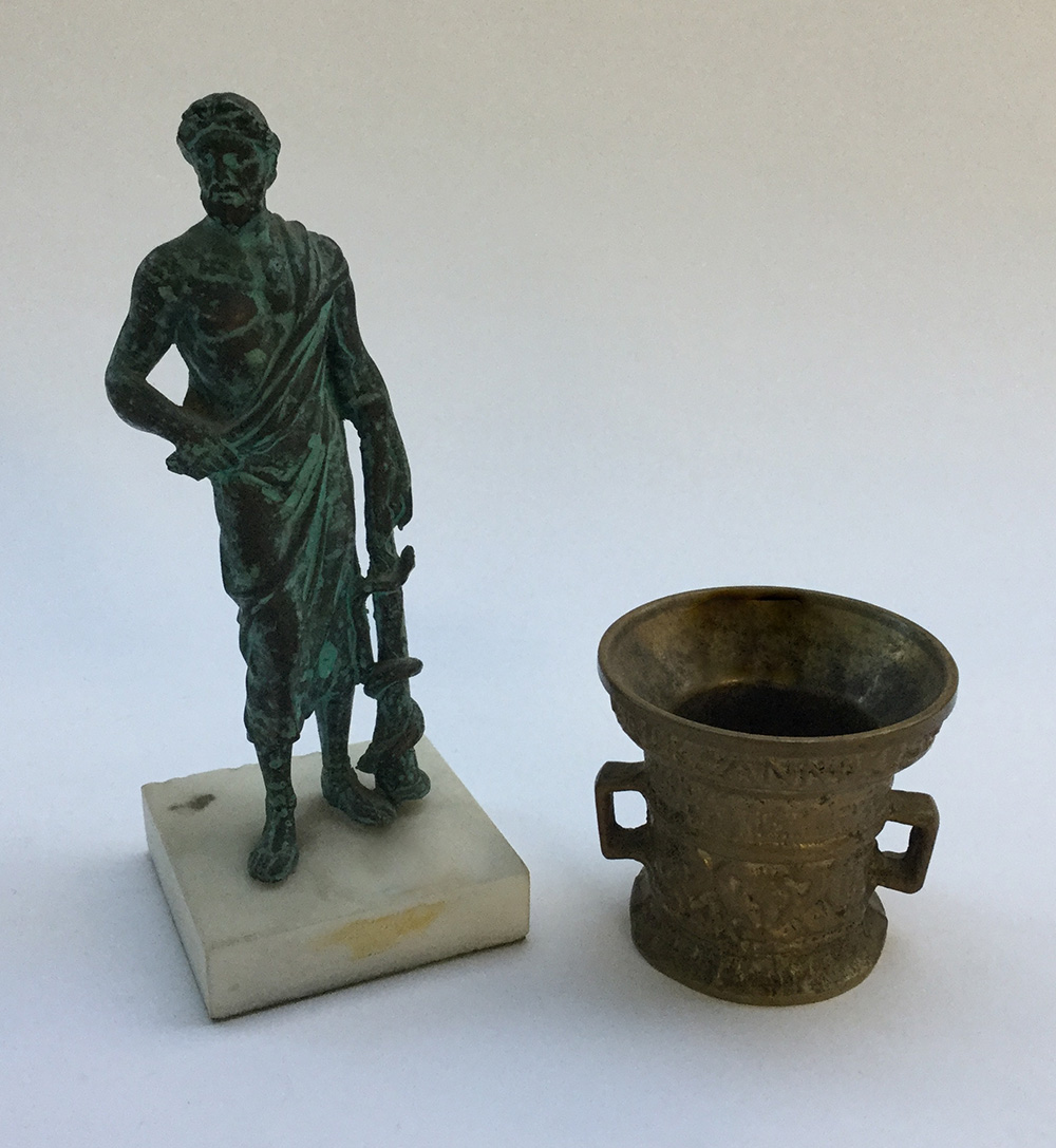 Lotto composto da un piccolo mortaio ed una scultura in bronzo su base in marmo (difetti)