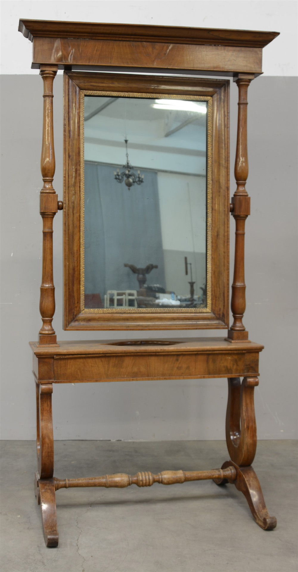 Psiche in noce con specchio besculante e cassetto nella fascia, traverse...