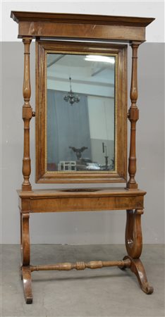 Psiche in noce con specchio besculante e cassetto nella fascia, traverse tornite. Sec. XIX (cm 94x197x64) (difetti)
