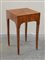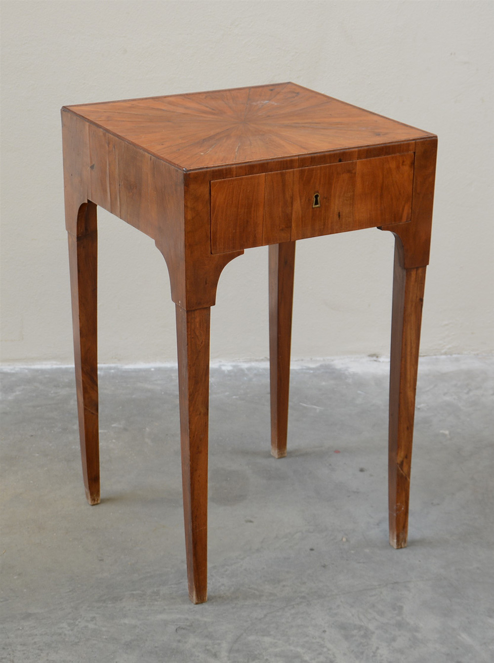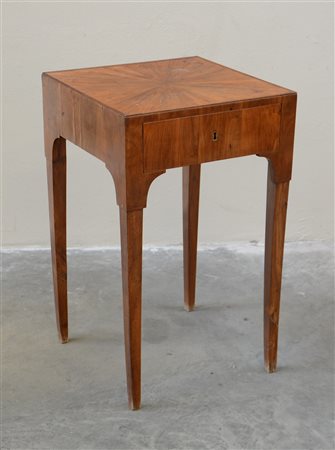 Tavolino con pianetto quadrato interamente lastronato in noce, un cassetto nella fascia, gambe rastremate. Secolo XIX (cm 46x76x46)(difetti)