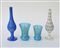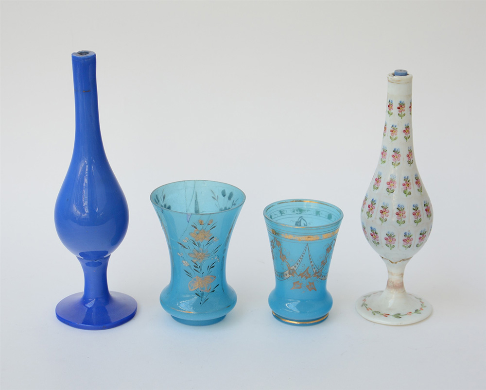 Manifattura orientale. Lotto composto da due bottiglie e due bicchieri in opaline di diverso decoro (difetti)
