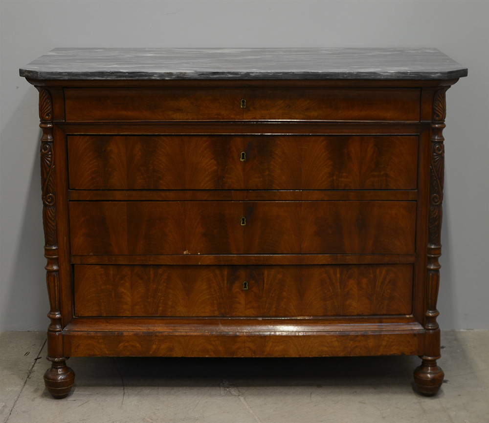 Comò in noce e piuma con tre cassetti e mezzo con montanti intagliati, piano in marmo. Sec. XIX (cm 120x95x61) (difetti)