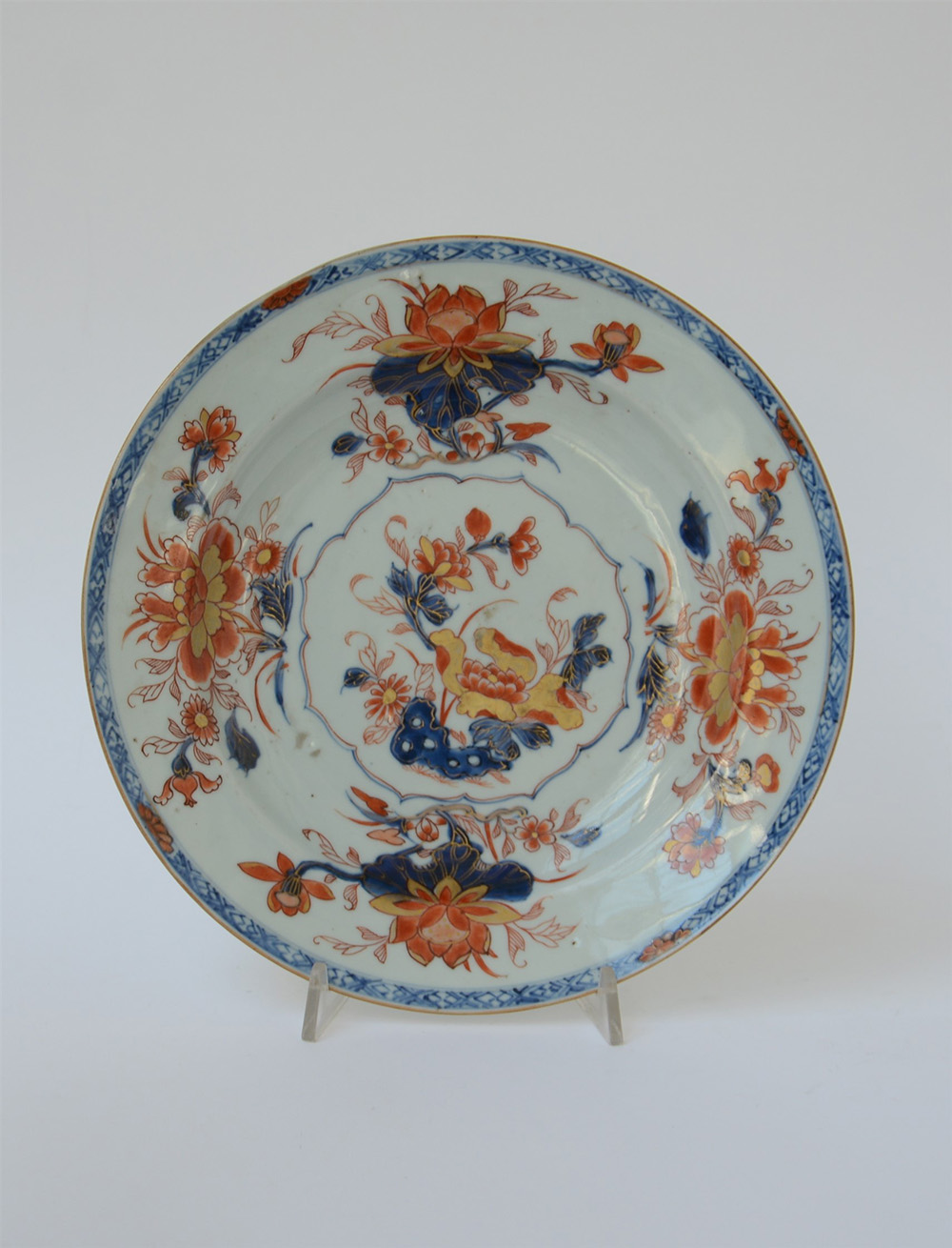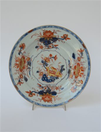 Piatto in porcellana Imari decorato con motivi floreali e geometrici (lievi difetti) Cina, sec. XVIII (d. 27,5 cm.)