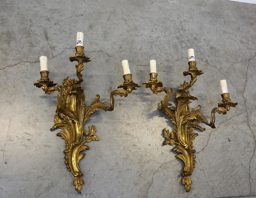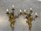 Coppia di applique in bronzo a tre fiamme decorata a fiori e volute fogliate...