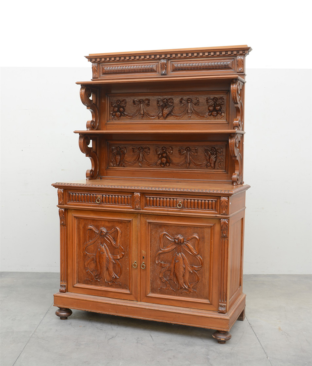 Credenza con alzata a due ripiani in legno intagliato a nastri, uccelli e frutta, parte inferiore a due cassetti e due sportelli, piedi a cipolla (cm 134x202x60)(difetti)