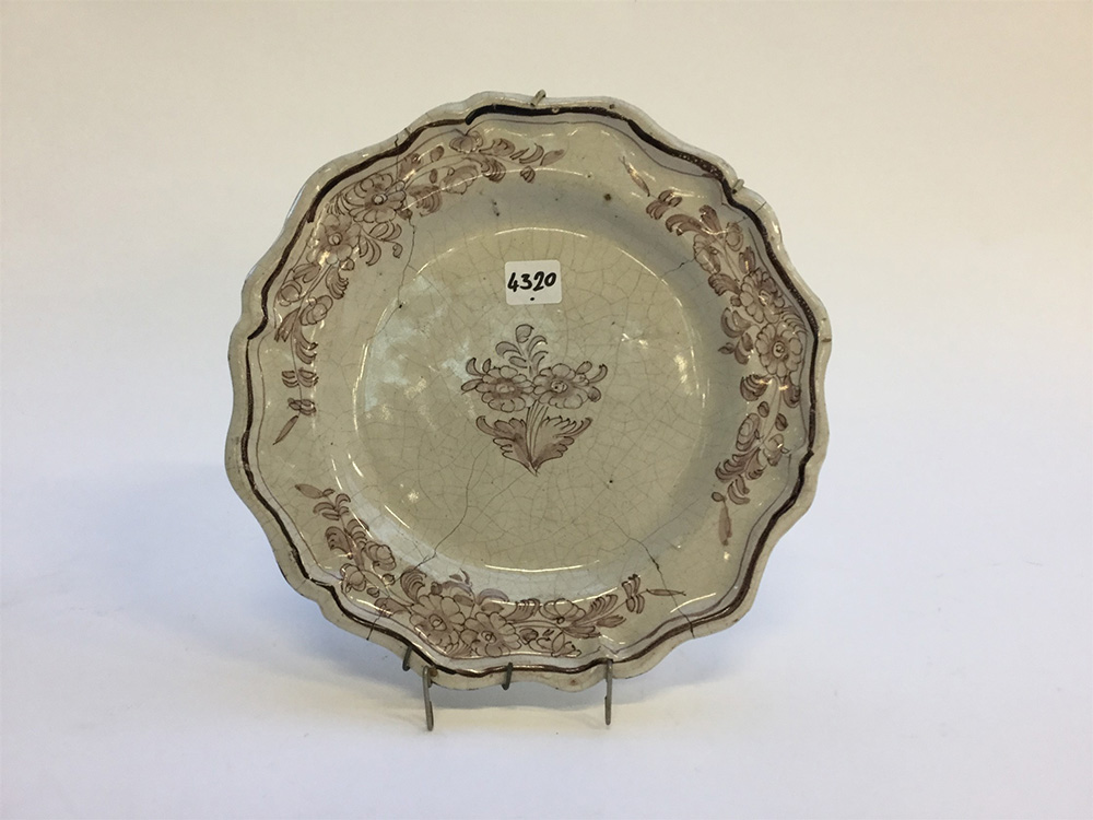 Manifattura del secolo XVIII piatto in maiolica a bordo sagomato decorato in monocromia a motivi floreali (d cm 24)(difetti)