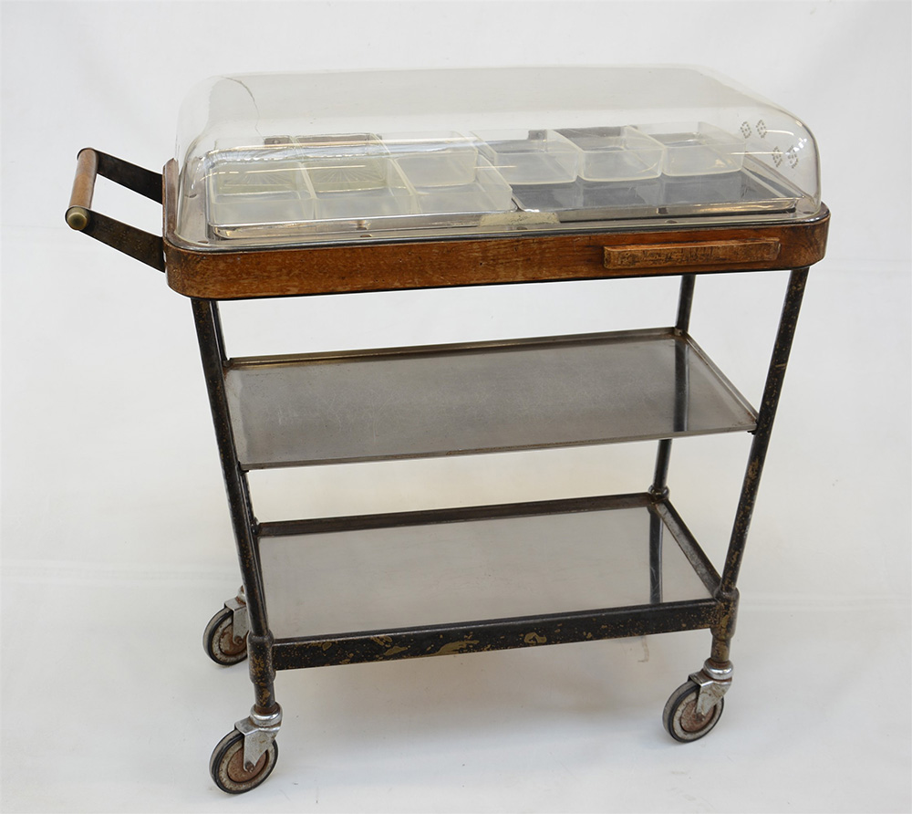 Carrello portavivande in alpacca e ottone, piano in legno e acciaio, coperchio in plexiglas. Produzione Broggi, Milano, anni '30/40 (difetti)