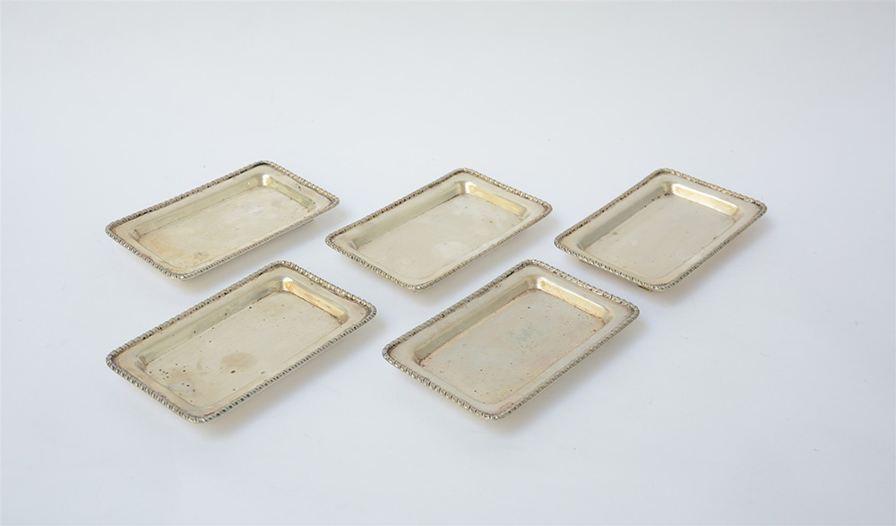 Gruppo di cinque vassoietti in argento di forma rettangolare con bordura San Marco (gr tot. 830 ca.) (cm 17,5x10,5) (lievi difetti)