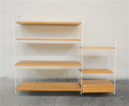 Libreria pensile con montanti in ferro dipinti di bianco a sei ripiani ed un cassetto in legno(cm 95x160x30) (difetti)