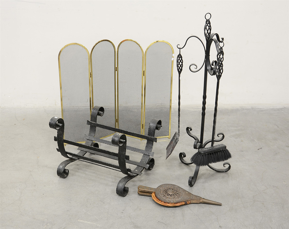 Lotto composto da un porta attrezzi da camino con tre attrezzi e un porta legna in ferro battuto, uniti ad un soffietto da camino in rame e un parascintille (difetti)