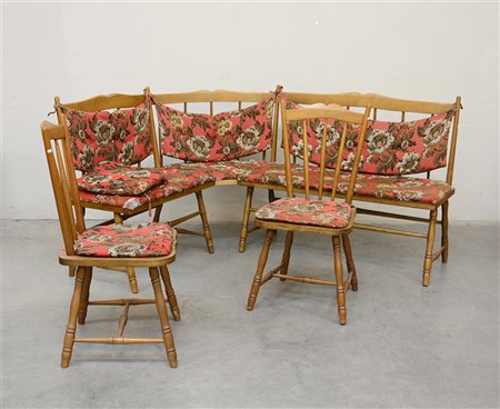 Lotto composto da una panca ad angolo e due sedie con schienale a listelli in...