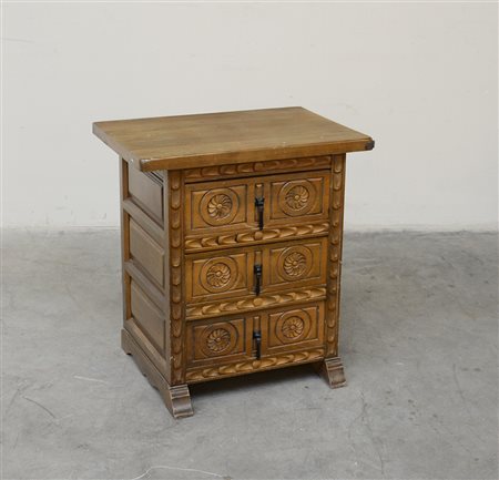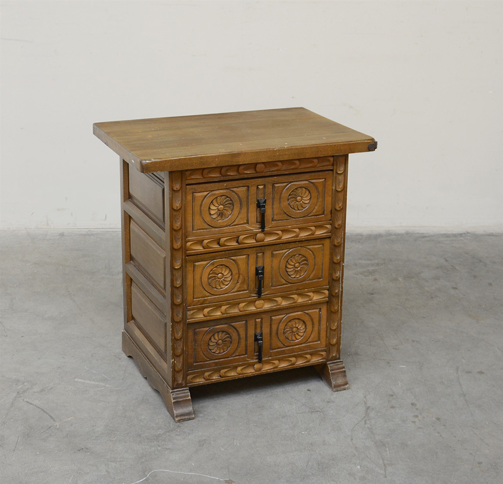 Mobiletto in legno a tre cassetti intarsiati a rosoni (cm 64x70x44) (difetti)