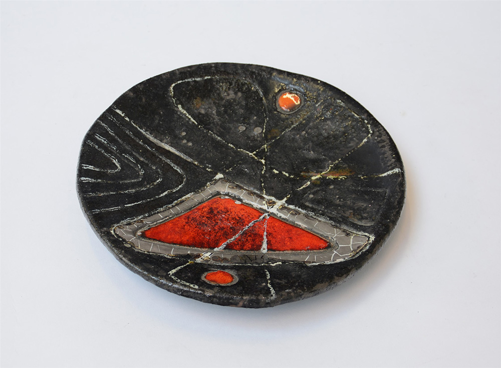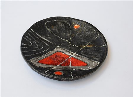 Manifattura del secolo XX, piatto in terracotta smaltata a lustro (d cm 23)(difetti)