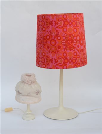 Lotto di due lampade da tavolo in metallo laccato bianco con paralumi in stoffa (misure diverse) (difetti)