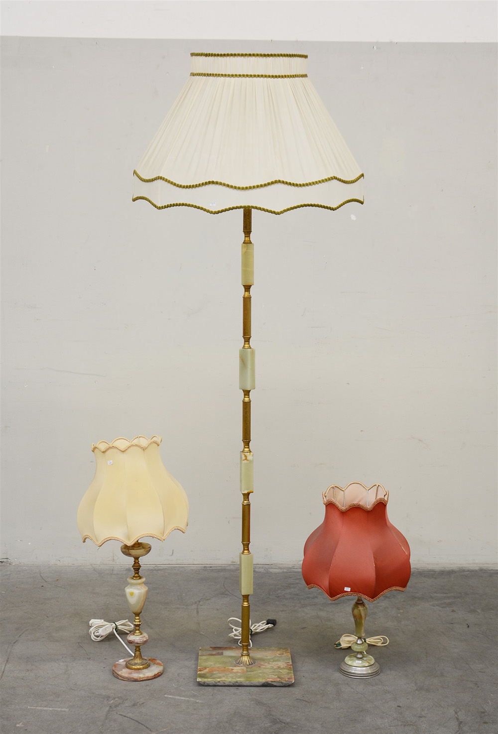 Lotto composto da una lampada da terra e due da tavolo in onice e metallo con paralumi in stoffa (difetti)