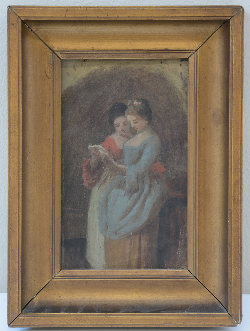Scuola del sec. XIX "La lettura" olio su tela applicata su cartone (cm 20x12) In cornice