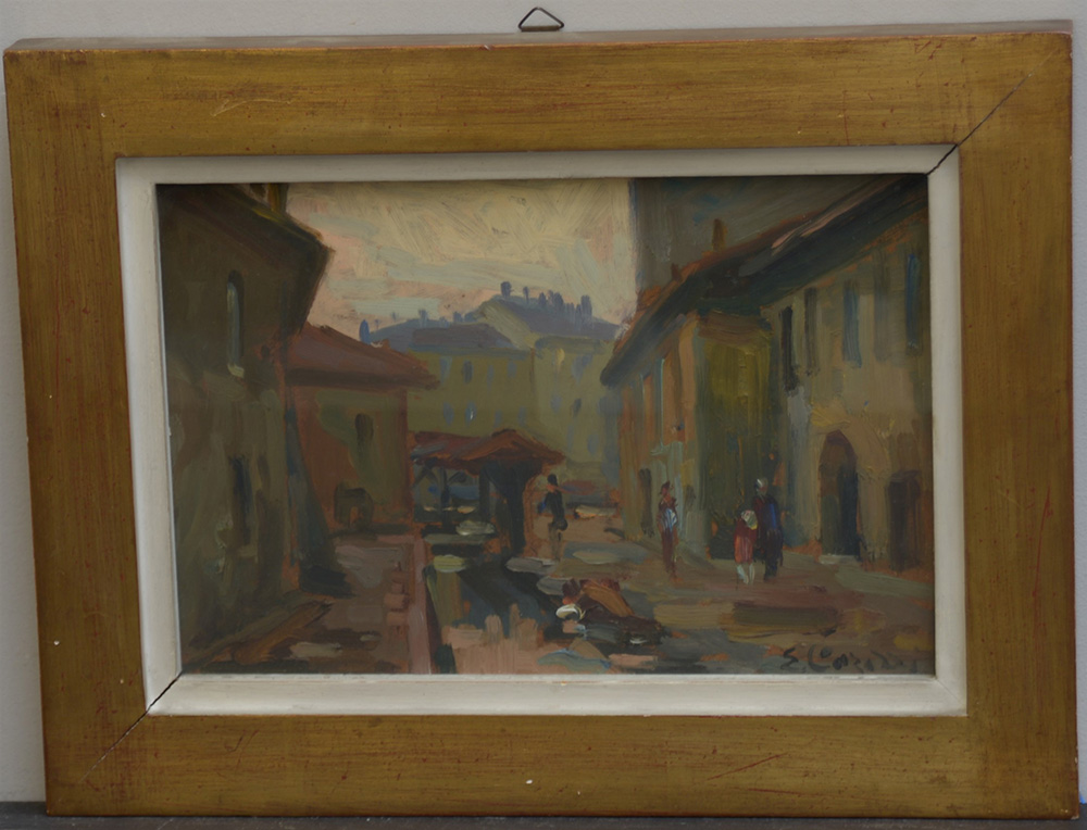Enrico Carozzi "Vicolo delle lavandaie" olio su masonite (/cm 20x30) firmato in basso a destra, etichetta al verso della Galleria del Barcon, Milano. In cornice (difetti)