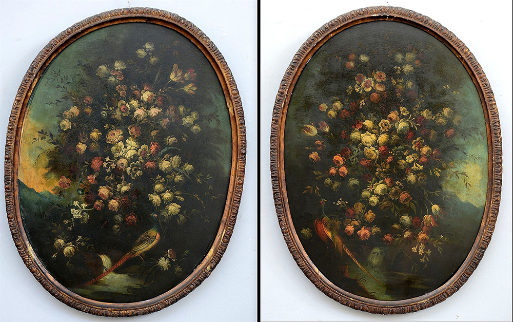 Ignoto "Mazzi di fiori in paesaggi" coppia di olii su tela (cm 130x95) In cornici dorate (difetti)