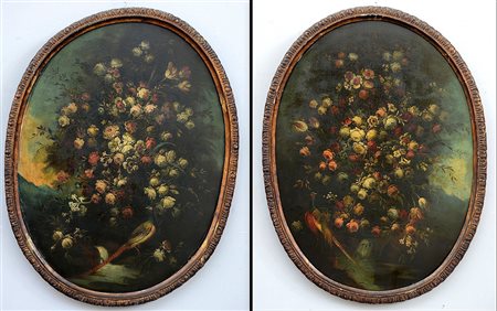 Ignoto "Mazzi di fiori in paesaggi" coppia di olii su tela (cm 130x95) In...