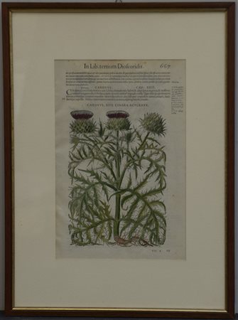 Pagina acquerellata tratta dall'erbario "Dioscorides Pedacius" nell'edizione di Pietro Mattioli raffigurante la pianta e i fiori del cardo (difetti)