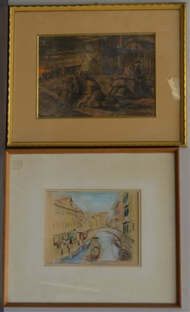 Lotto di due disegni a tecnica mista raffiguranti uno scorcio di canale e una scena con figure, autori e misure differenti. In cornici (lievi difetti)