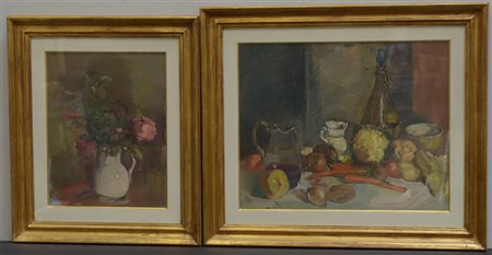 Ermete Limana "Natura morta con ortaggi" e "Vaso di rose" lotto di due olii su compensato (rispettivamente cm 40x50 e cm 38x30). Autentica della moglie al verso. In cornici
