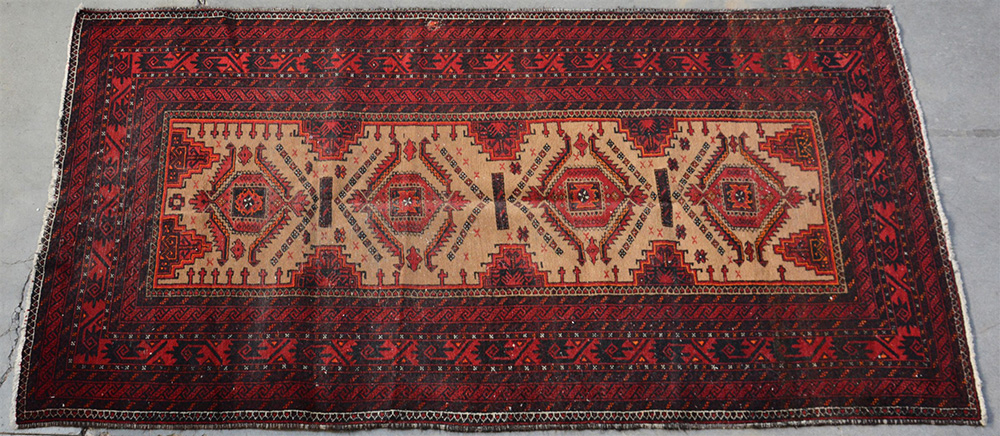 [Tappeti] Tappeto Kizyl Ayak, Turkestan occidentale, sec. XX. Disegno a medaglioni rossi su fondo cammello, grandi bordure a fondo rosso scuro (cm 225x122)(difetti)
