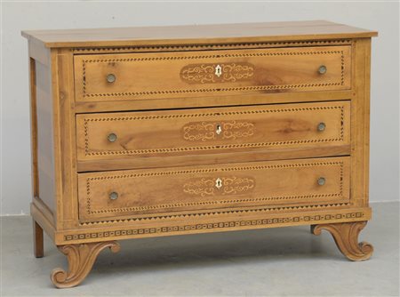 Cassettone in noce a tre cassetti intarsiato a motivi geometrici e vegetali, piedi anteriori sagomati ed intagliati, secolo XIX (cm 126x90x55)(difetti e restauri)