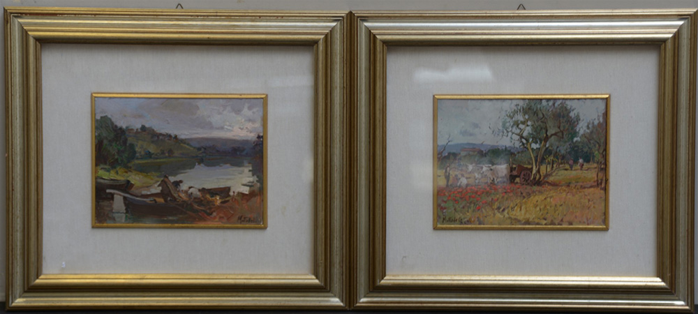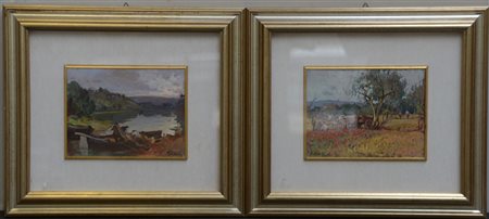 Giuseppe Mottadelli "Paesaggi" coppia di dipinti ad olio su masonite (cm 16x21) in cornici