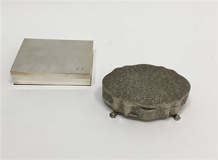 Lotto composto da una scatola in argento rettangolare liscia cifrata FF ed una scatola ovale sagomata incisa a girali fogliati. Italia, sec. XX (gr 420 ca.) (lievi difetti)