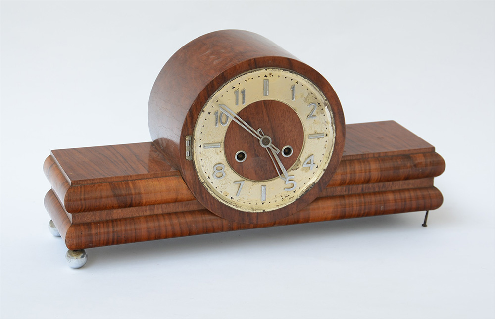 Orologio da tavolo con cassa in legno lastronato in radica, quadrante a numeri arabi, sec. XX (difetti e gravi mancanze)