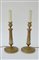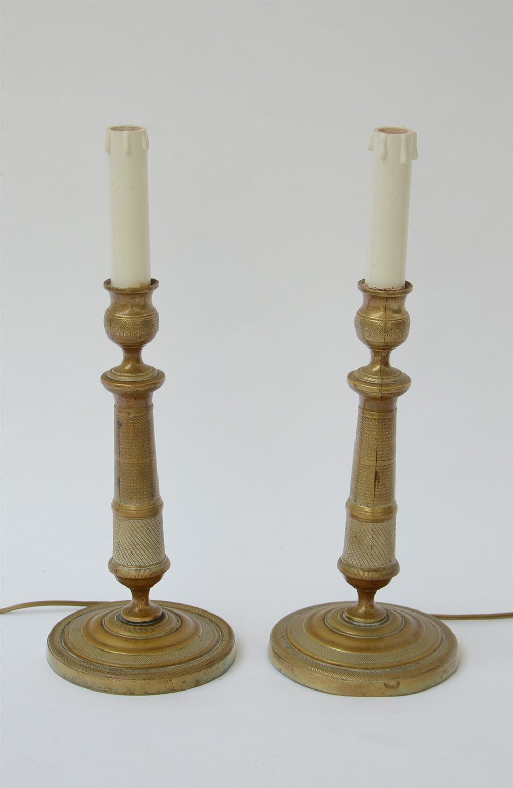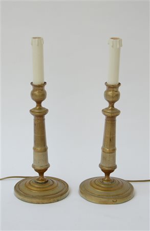 Coppia di candelieri ad una fiamma in metallo dorato e cesellato, sec. XIX (h cm 26)(montati a luce elettrica in epoca posteriore, ventoline in cartone, difetti)