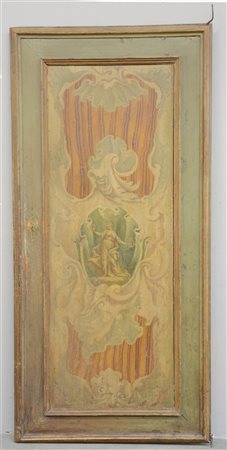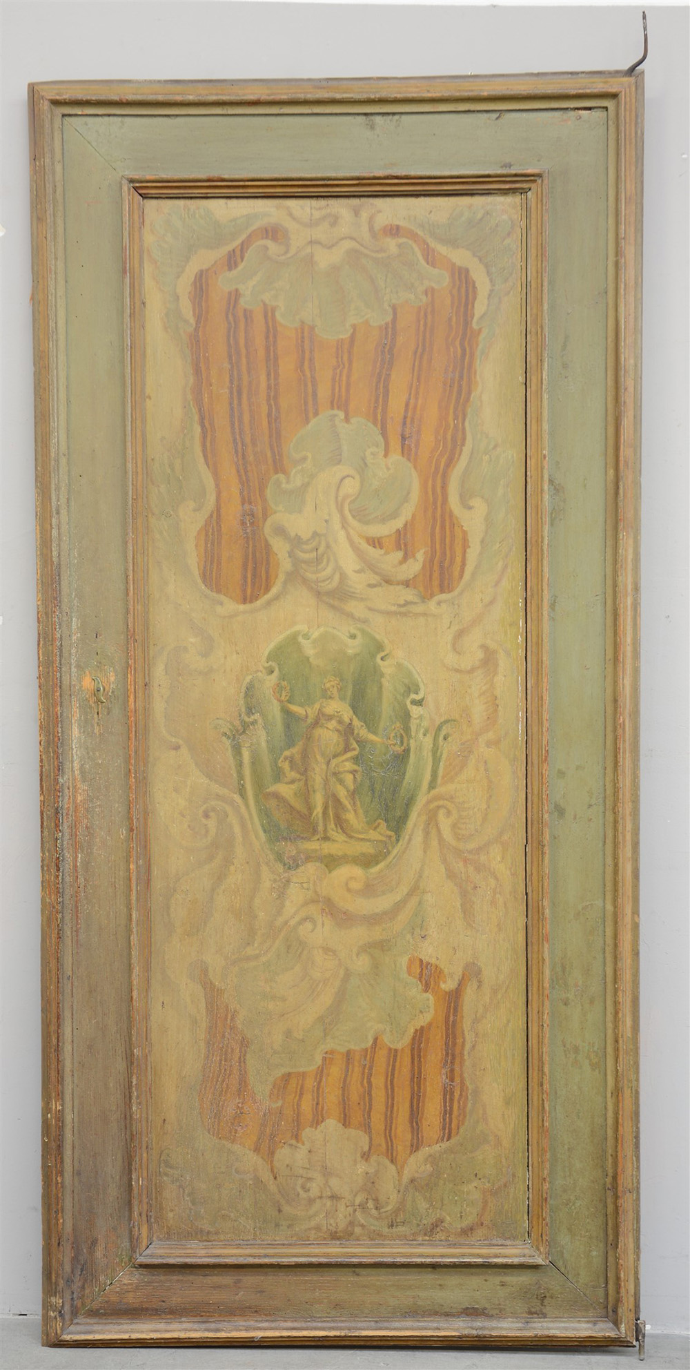 Antica porta ad un battente, in legno laccato su entrambi i lati a fondo verde e decorata in policromia a cartigli (cm 193x93)(difetti)