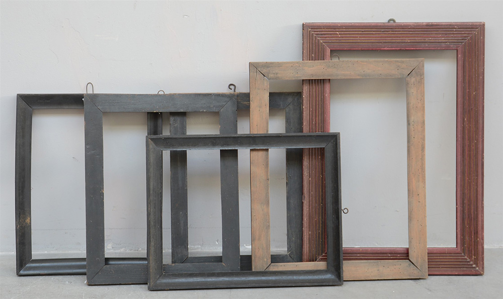Gruppo di sei cornici in legno di diversa epoca, misura e decoro (difetti)