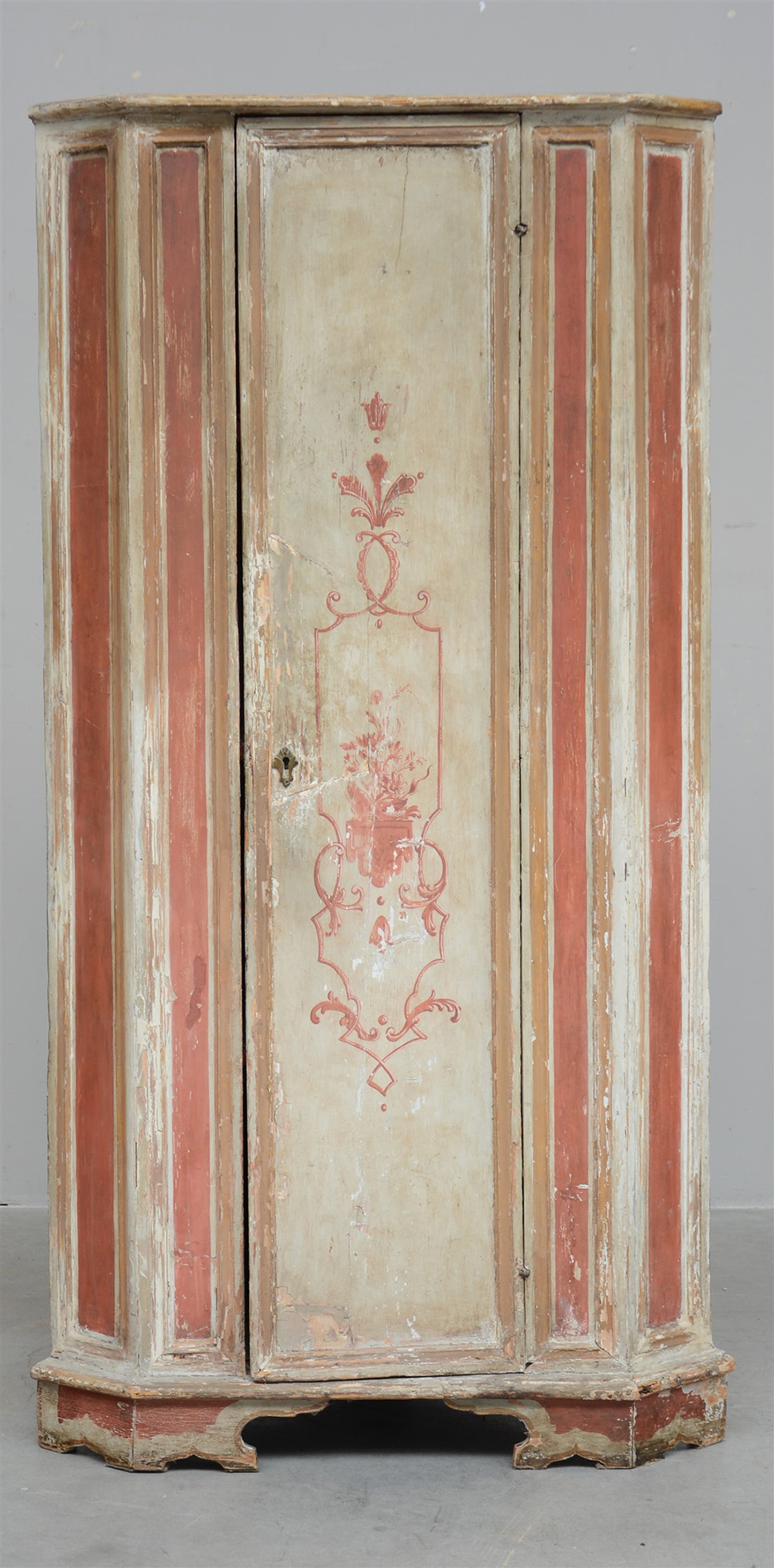 Antica angoliera ad un anta interamente laccata avorio e rosso manganese decorata con fiori entro cartiglio, piedi a mensola (cm 84x165x54)(difetti)