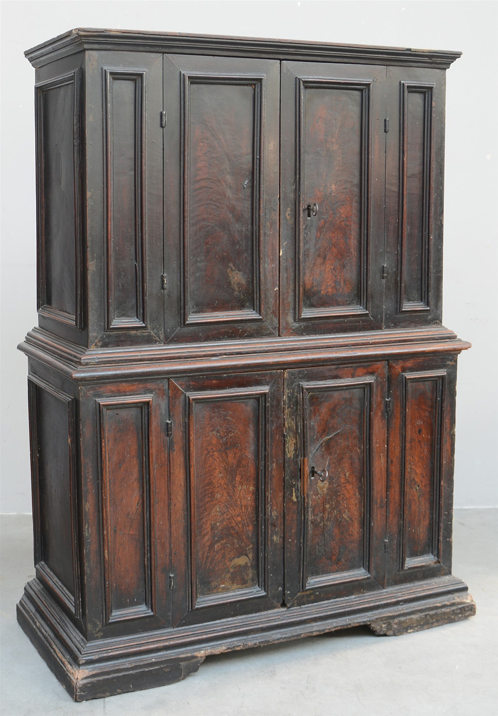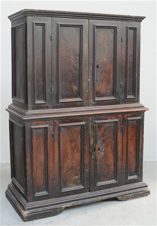 Credenza a due corpi in noce a quattro ante pannellate decorate da specchiature in radica, piedi a mensola, Emilia sec. XVII (cm 110x164x57)(difetti e restauri)