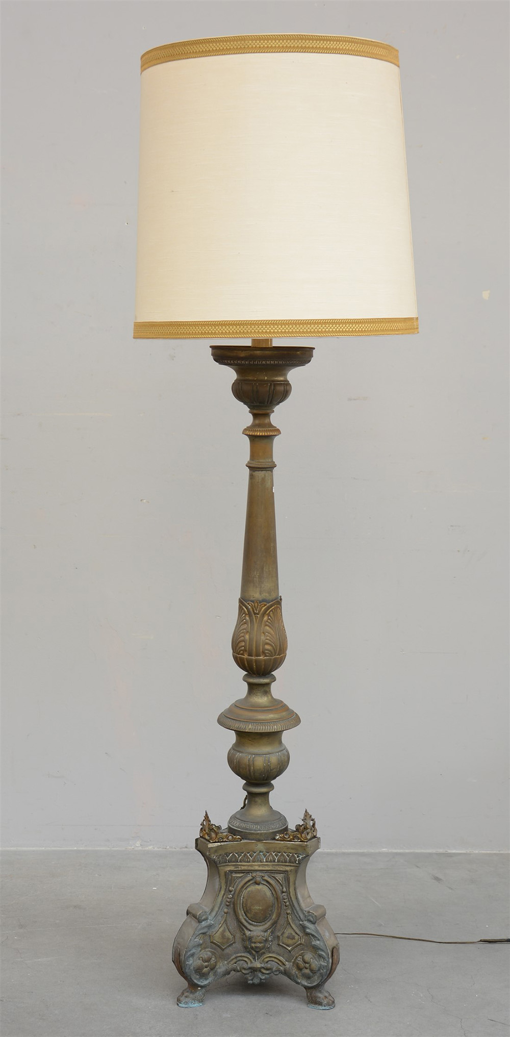 Candeliere da terra tripode in metallo decorata a motivi vegetali e fregi (h cm 124)(montata a luce elettrica in epoca posteriore, paralume in stoffa, difetti)