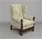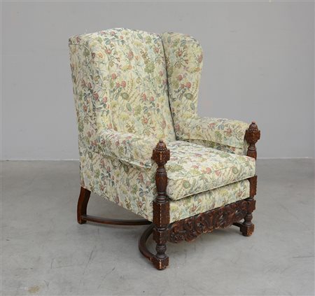 Poltrona a orecchioni con montanti e fascia intagliati a motivi vegetali e fiori, rivestita in tessuto a fiori (difetti)