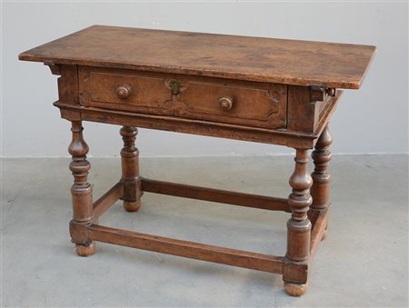 Tavolo in noce ad un cassetto sottopiano pannellato, quattro gambe tornite riunite da traverse piatte, inizio sec. XVIII (cm 122x82x60)(difetti e restauri)