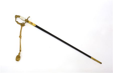 Spada da apparato di Funzionario Civile, Austria, metà sec. XIX. Lama a sezione di losanga con scorrimento centrale e parzialmente incisa a motivi vegetali. Impugnatura in bronzo dorato con pelta riportante due profili di teste di leone con al centro la gorgona. Guardia formata da serpe intrecciata e pomolo di codolo in testa leonina. Impugnatura con doppie guance in madre perla, con fodero in pelle e puntale di innesto in metallo dorato (l. 92 cm) (lievi difetti)
