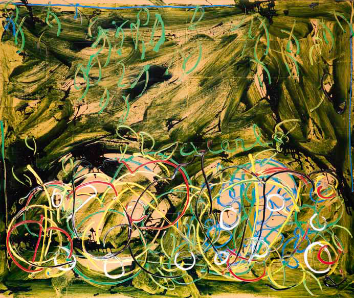 MARIO SCHIFANO Homs 1934 – Roma 1998 Acerbo, 1983 smalto e acrilico su carta applicata su tela, cm 160x188. Titolato al centro: acerbo Provenienza: Roma, Galleria Cleto Polcina; Milano, Christie’s, 25/05/2009, lotto n. 47. 55. Opera archiviata nell’Archivio Generale dell’Opera di Mario Schifano con il n. 01442090404 in data 7/05/2009