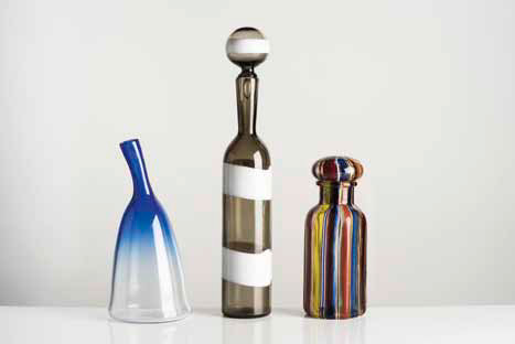 Venini Bottiglia in vetro talpa con fasce in lattimo, anni ‘50. Firma incisa: venini italia Etichetta: venini made in murano altezza cm 45.